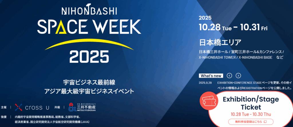 日本橋を宇宙ビジネスの中心地とする取り組みの一環で開催されるイベントで、国内外の宇宙関連団体や企業が集まり、最新の宇宙ビジネスや技術について発表します。宇宙スタートアップ向けのピッチイベントやパネルディスカッションが開催されるほか、宇宙産業の未来に関するシンポジウムも予定されています。